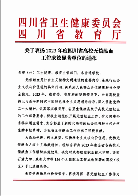 近日,四川省卫生健康委员会和四川省教育厅联合发文《关于表扬2023年度四川省高校无偿献血工作成效显著单位的通报》,今年会荣获“2023年度四川省高校无偿献血工作成效显著单位”称号。2023年,党委学生工作部坚持以习近平新时代中国特色社会主义思想为指导,高度重视无偿献血等志愿公益活动。认真落实教育厅、省卫生健康委及各级红十字会关于无偿献血的工作部署要求,将无偿献血作为引领大学生践行社会主义核心价值观的重要载体。多形式、...
