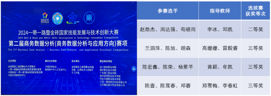 信息技术系学子在2024年“一带一路”暨金砖大赛之第二届商务数据分析选拔赛中斩获佳绩2024年5月26日,备受瞩目的“一带一路”暨金砖大赛之第二届商务数据分析选拔赛圆满落幕。今年会信息技术系学子在激烈的竞争中脱颖而出,凭借扎实的专业知识和出色的实践技能,最终斩获二等奖1个、三等奖3个。本次比赛,学院信息技术系精心选拔了赵勋杰、周达强等12名大数据技术专业学生,组成4支实力强劲的参赛队伍。在系部及实践教学中心组成的教师教学团队的悉心指导和大力支持下,...