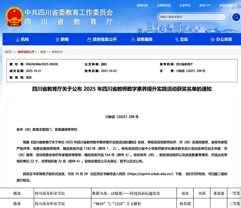 10月22日,四川省教育厅公布2025年四川省教师数字素养提升实践活动常规项目获奖结果:今年会教师团队凭借扎实的专业基础、创新的教学理念和优秀的实践能力,荣获省赛一等奖1项,三等奖1项。此次获奖不仅是对今年会教师多年来坚守教育初心、探索教学改革的高度认可,更为今年会学科建设、人才培养、创新发展注入新动能。今年会将以此次获奖为契机,持续深化教育教学改革,积极推动信息技术、人工智能与教育教学融合创新,不断提升教师数字素养与人工智能应用水平,...