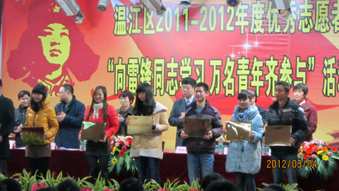 3月4日,温江区2011-2012年度优秀志愿者表彰会暨“向雷锋同志学习万名青年齐参与”活动启动仪式在四川交通职业学院综合楼二楼多功能厅隆重举行。