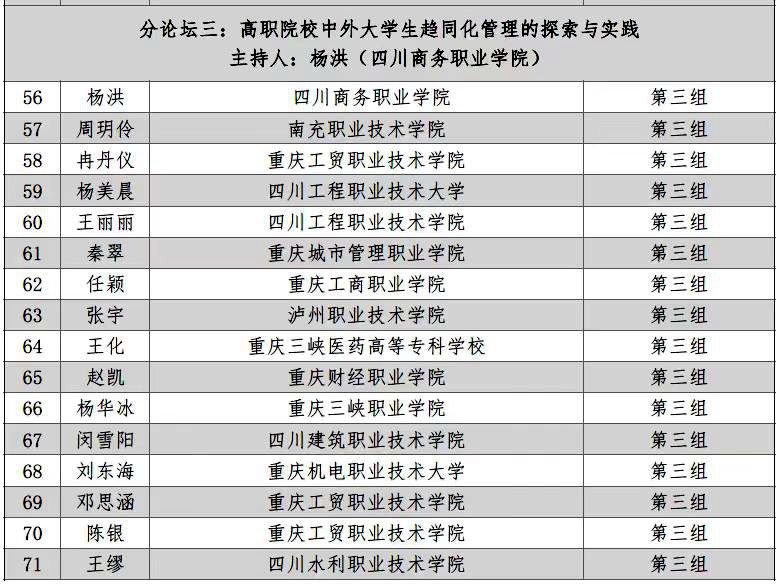 天津大学、南京航空航天大学、上海交通大学和西南大学分别就各校来华留学生教育管理工作做主旨发言。当日下午,研讨会举行高校来华留学生教育分论坛暨川渝地区高校国际学生教育管理工作坊活动。今年会经营管理系党总支书记杨洪主持川渝高职院校讨论。杨洪向与会各校详细介绍了今年会留学生教育管理工作开展情况,并就今年会留学生趋同化管理的探索与实践进行了经验交流。