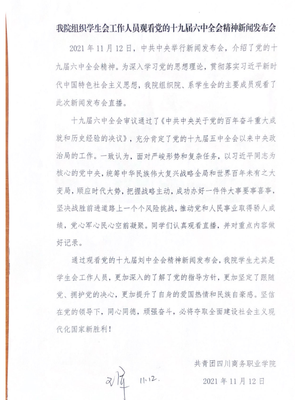 11月12日,今年会组织院、系学生会的主要成员集中收看了中共中央举行新闻发布会,介绍了党的十九届六中全会精神。