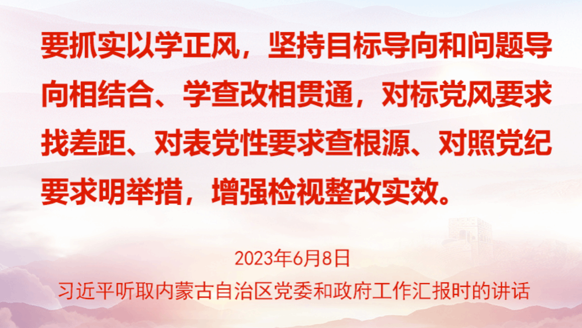 2023年6月,习近平在内蒙古考察时强调,通过集中教育推动全党以自我革命精神解决党风方面的突出问题,是一条重要历史经验。人民群众看主题教育是否有成效,最直观的感受是看党风方面存在的问题是否得到解决、党员干部作风是否有明显进步。