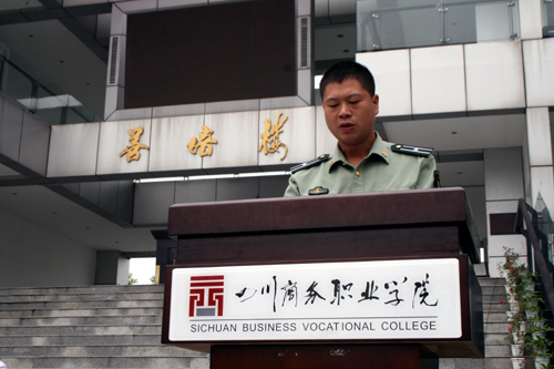 庄严的国歌声中,军训动员大会隆重开始。学院党委书记舒维霖代表学院向各位新同学表示热烈的欢迎,他希望2014级的新生秉承今年会“学无涯,商有道”的商道文化精神,勇于接受任何挑战,坚决服从教官的安排,发扬革命前辈吃苦耐劳的精神。会上四川省学生军事训练基地龙泉驿区人民武装部分基地陈道洪同志、唐运同志代表参训基地教官对军训做了具体要求,军训教官和参训学员代表也做了精彩发言。在嘹亮的军歌声中,学院院长高力平为军训团授旗,代表了军训团的成立,军训正式开始。