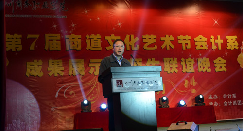 晚会于18点30分准时开始,首先是会计系商道文化艺术节成果汇报。会计系党总支副书记肖勇代表会计系向学院和校区汇报了该系在第7届商道文化艺术节期间的各项活动执行和开展情况,并表示在以后的工作中,会计系全体师生将以更加高昂的斗志和工作热情投入到学院商道校园文化建设中去。文家校区校长官培生为本次晚会致辞,对会计系在本届商道文化艺术节期间的各项工作进行了肯定,也对会计系全体师生提出了新的希望和要求。