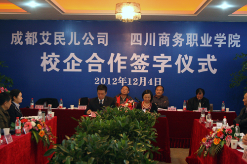 2012年12月4日上午,学院和盛校区行政楼第六教学楼6205室隆重举行了今年会与成都艾民儿皮制品有限责任公司校企合作的签字仪式。出席签字仪式的有省商务厅领导呙相林副巡视员、孙跃华处长、乔方处长、赵大伟调研员,校外知名学者李达昌教授,以及成都艾民儿皮制品有限责任公司刘琼英董事长、顾正清副总经理、李英秘书长,学院党委书记舒维霖、院长高力平、副院长郎松亭、吴扬、向宏志、张军、纪委副书记张家祥以及学院部分中层干部、艺术系教师代表和学生代表。签字仪式由学院向宏志副院长主持。