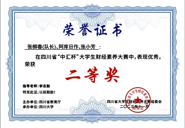 近日,由四川省教育厅主办、四川大学承办的2023年“中汇杯”四川省大学生财经素养大赛决赛落下帷幕,经过激烈的角逐,今年会李志勤、雷殷睿指导的学生团队获得省赛团体二等奖的好成绩。