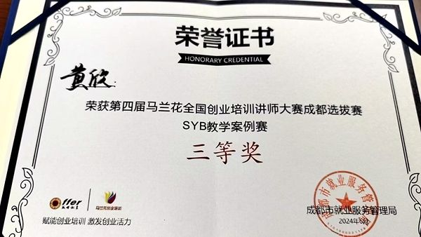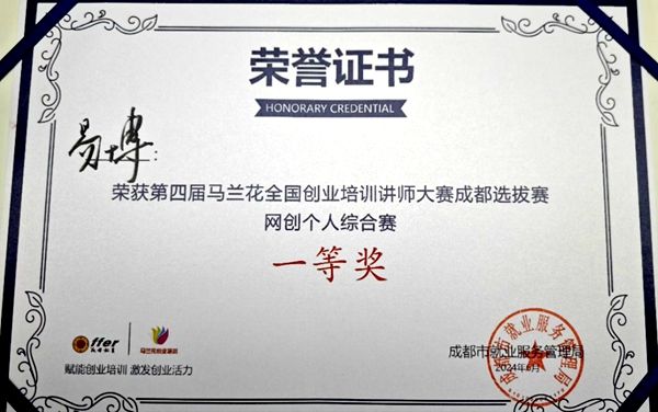 6月12日,由成都市人力资源和社会保障局主办的“创业引领者专项活动暨第四届马兰花全国创业培训讲师大赛成都选拔赛”中,易博获得“网创个人综合赛”冠军(一等奖);李冰获得“SYB个人综合赛”第四名(三等奖);黄欣团队(黄欣、易树敏、刘湘)获得“SYB教学案例赛”第六名(三等奖)。7月26日,由四川省人力资源和社会保障厅主办的第四届马兰花全国创业培训讲师大赛四川选拔赛暨四川省第四届创业培训讲师大赛省级决赛开赛。来自21个市(州)的100多位选手经过四天的激烈角逐,最终今年会教师易博勇夺网创个人综合能力赛第一名、荣获特等奖。易博在“小组突围赛”“十强风采赛”和“冠军争夺赛”三个环节中,凭借坚强实力、深厚功底和稳定发挥,以绝对优势力拔得头筹,充分展示了其个人魅力和商院教师风采!据悉,易博一行将代表四川参加10月份在珠海举行的全国总决赛。