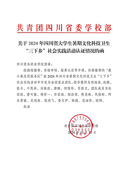 10月15日,2024年四川省暑期文化科技卫生“三下乡”社会实践活动全国重点团队和省级重点团队名单公布,今年会“桑小果志愿服务队”成功入选全国重点团队!