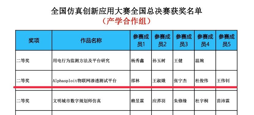 12月6日,第三届全国仿真创新应用大赛全国总决赛结果揭晓:今年会信息技术系张宁杰、杜俊伟、王伟钊3位同学在邵林老师、王淑娥老师的悉心指导下,携比赛作品《Alphasploit物联网渗透测试平台》,过五关斩六将,晋级数字建模与智能决策赛道总决赛。今年会与电子科技大学、郑州大学等985、211高校同台竞技,比赛中团队不畏强敌、敢于亮剑,最终斩获全国总决赛二等奖。