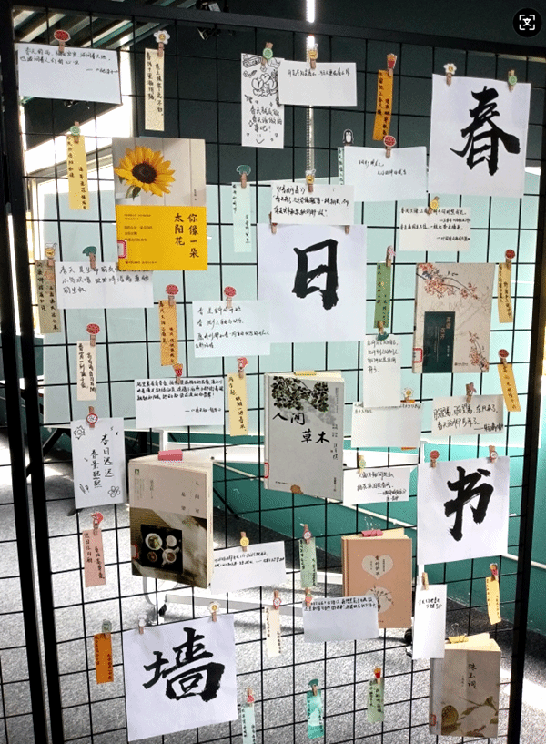 活动高潮是全体共读《花开不只在春天》。在静默阅读中,师生透过文字感悟生命的蓬勃力量。尾声时,集体朗诵共读朱自清的散文《春》,并将春日感悟与书籍推荐写在便笺上,贴成承载阅读热爱与自然礼赞的“春日书墙”,一张张色彩斑斓的便笺,宛如春日里竞相绽放的花朵,点缀其间,为现场平添了几分温馨而诗意的氛围。