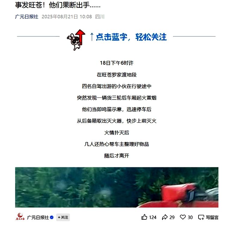 8 月 18 日下午,一场惊心动魄的救援在自驾途中上演。陈凤鸣与好友驾驶车辆,正沿着公路前行,突然,前方一辆货车车厢冒出滚滚浓烟,火光闪烁。他们敏锐地察觉到危险,毫不犹豫地立即鸣笛,向车主发出紧急提醒。在车主惊慌失措之际,陈凤鸣和好友迅速停车,从车内取出灭火器,毫不犹豫地冲向起火的货车。