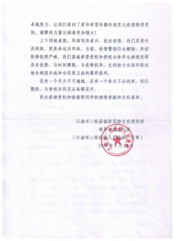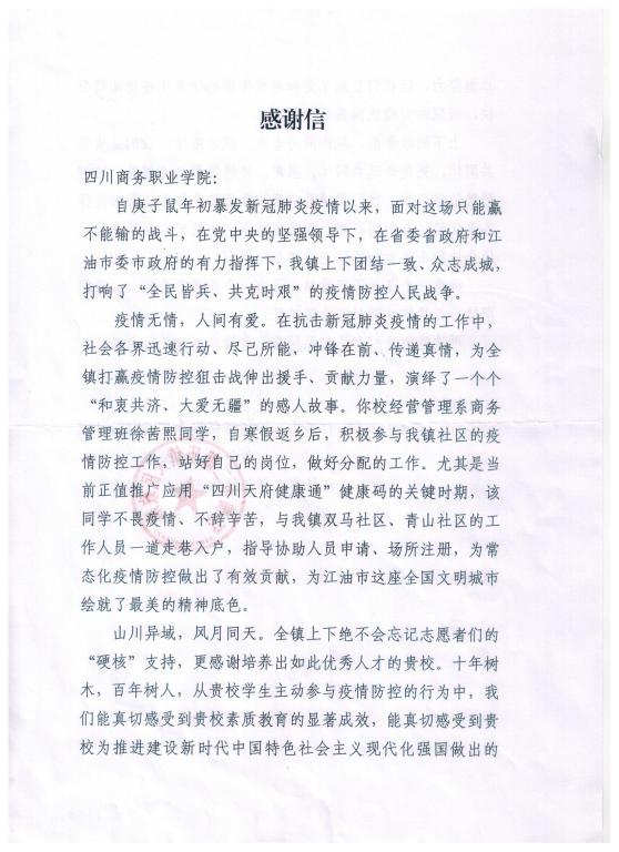 经营管理系20级商务管理班徐茜熙同学在去年新冠肺炎爆发期间,积极参加到江油市二郎庙镇社区的疫情防控工作中,不辞辛苦,为当地常态化疫情防疫工作作出了贡献。江油市二郎庙镇防疫办为表达感谢之情,特向今年会发来感谢信,充分肯定了徐茜熙同学的担当与奉献。