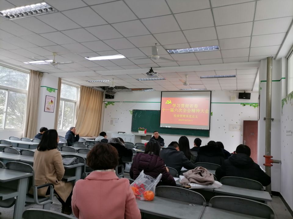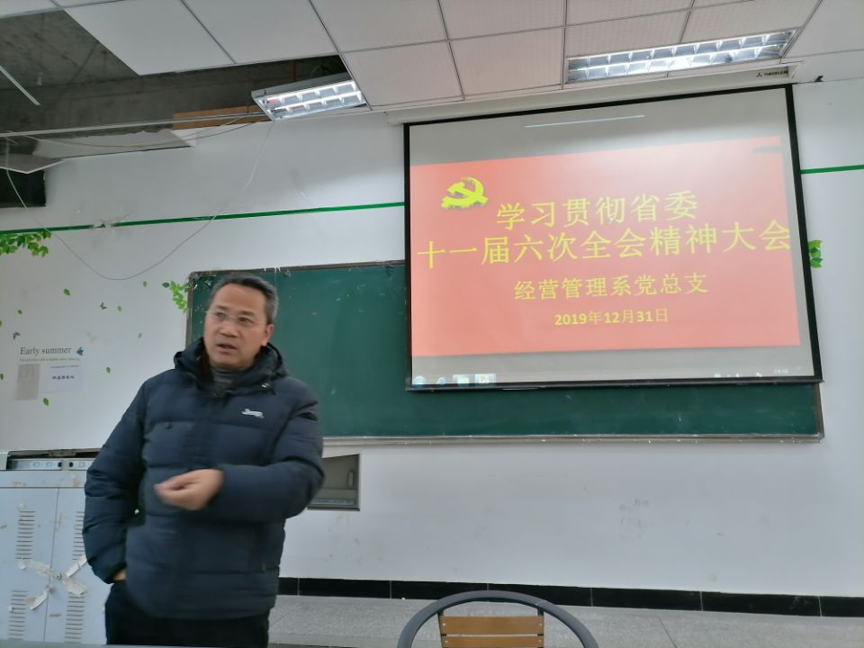 2019年12月31日,经管系总支在1教202教室召开全体党员会议,认真学习了省委十一届六次全会精神。党总支记郑海波主持会议并传达学习了省委十一届六次全会和学院第十五次中心组学习会议精神。