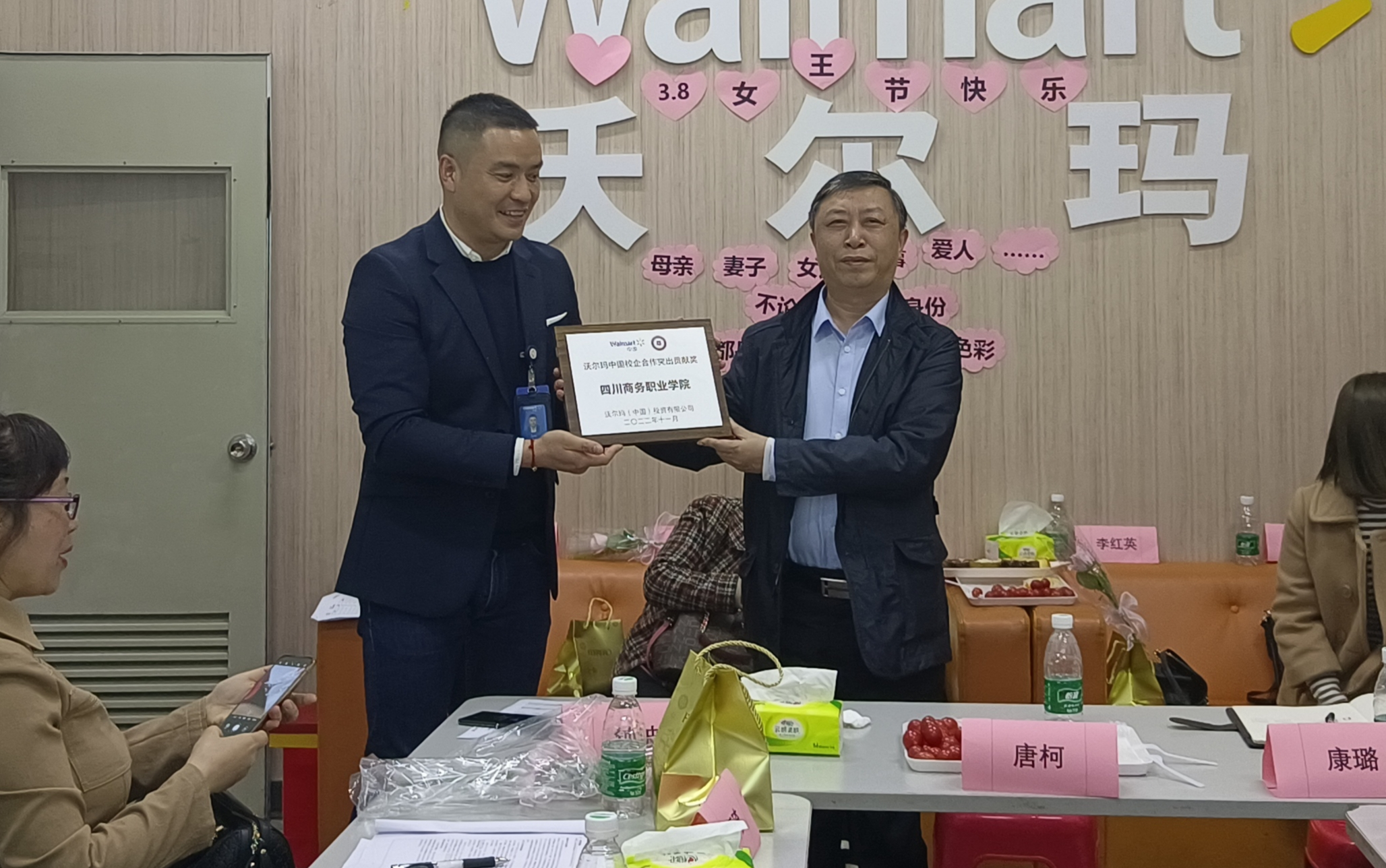 座谈会上,沃尔玛华西区区域人力资源经理钟波首先对今年会一行人员表示热烈欢迎,介绍了公司的基本情况、运行现状以及2023年的招聘计划,对今年会实习学生的综合表现进行了肯定性反馈,并向学院颁发了“沃尔玛中国校企合作突出贡献奖”牌匾,经营管理系连锁经营管理专业负责人刘刚老师荣获“沃尔玛中国校企合作优秀教师”称号。