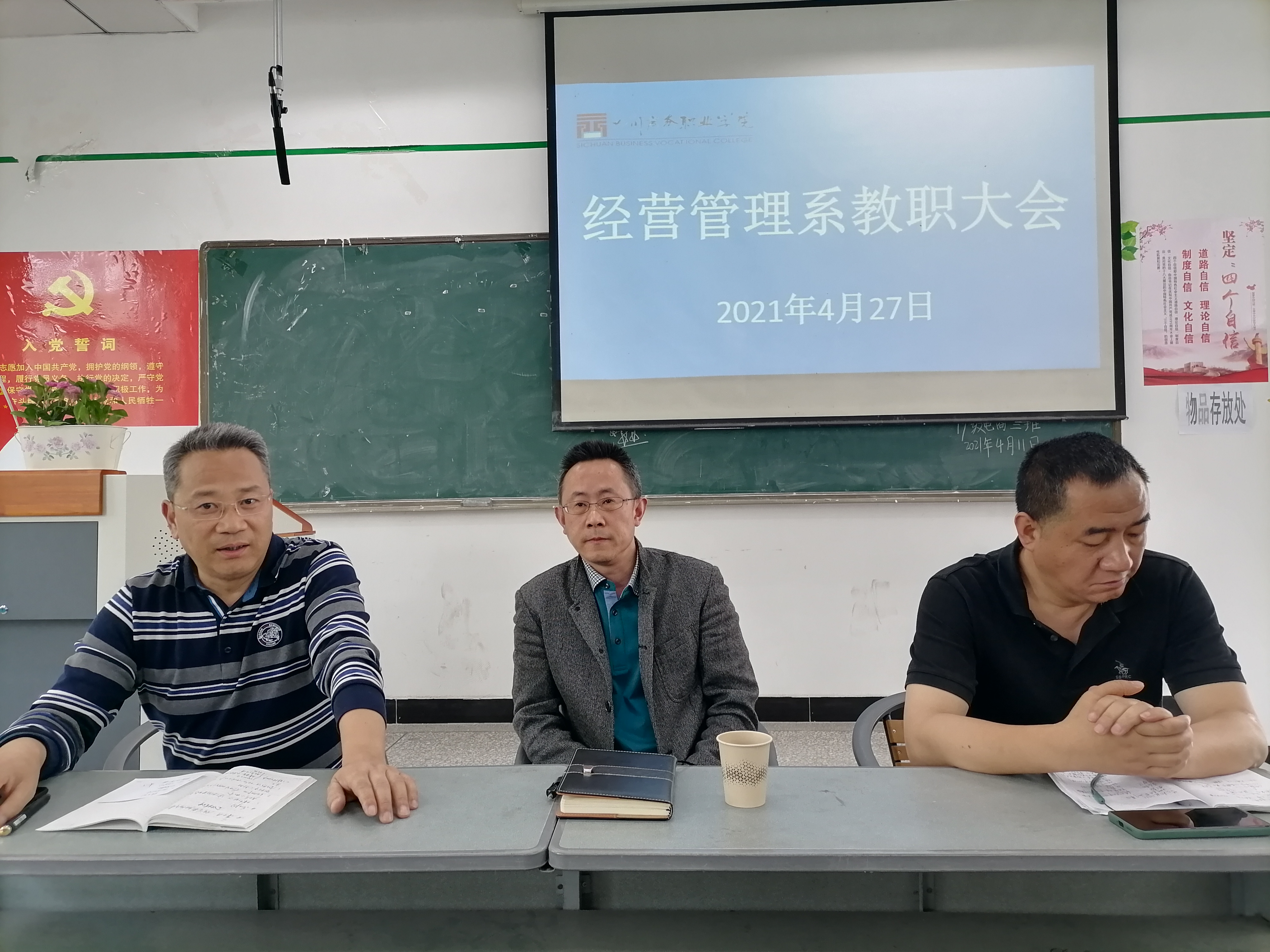 2021427日下午2时,经营管理系于第一教学楼202室召开全系教职工会议。出席本次会议的有学院党委委员、纪委书李文川,经管系主任梁栋,系党总支书记郑海波,系副主任王琦,全教师,会议由系主任梁栋主持。