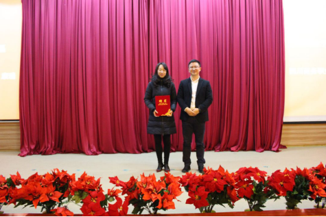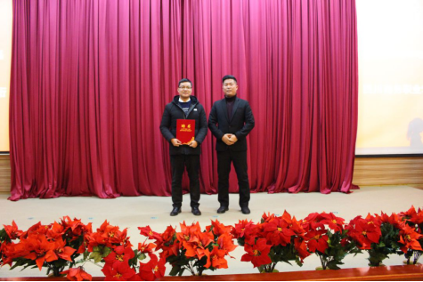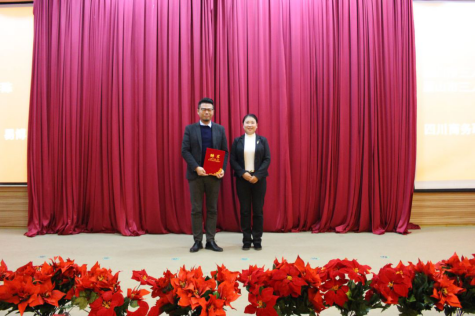 眉山市三人行创业服务有限公司总经理助理、眉山三人行创业孵化园副主任、党支部副书记李陈向今年会官方网站电子商务专业教师易博颁发兼职聘书。