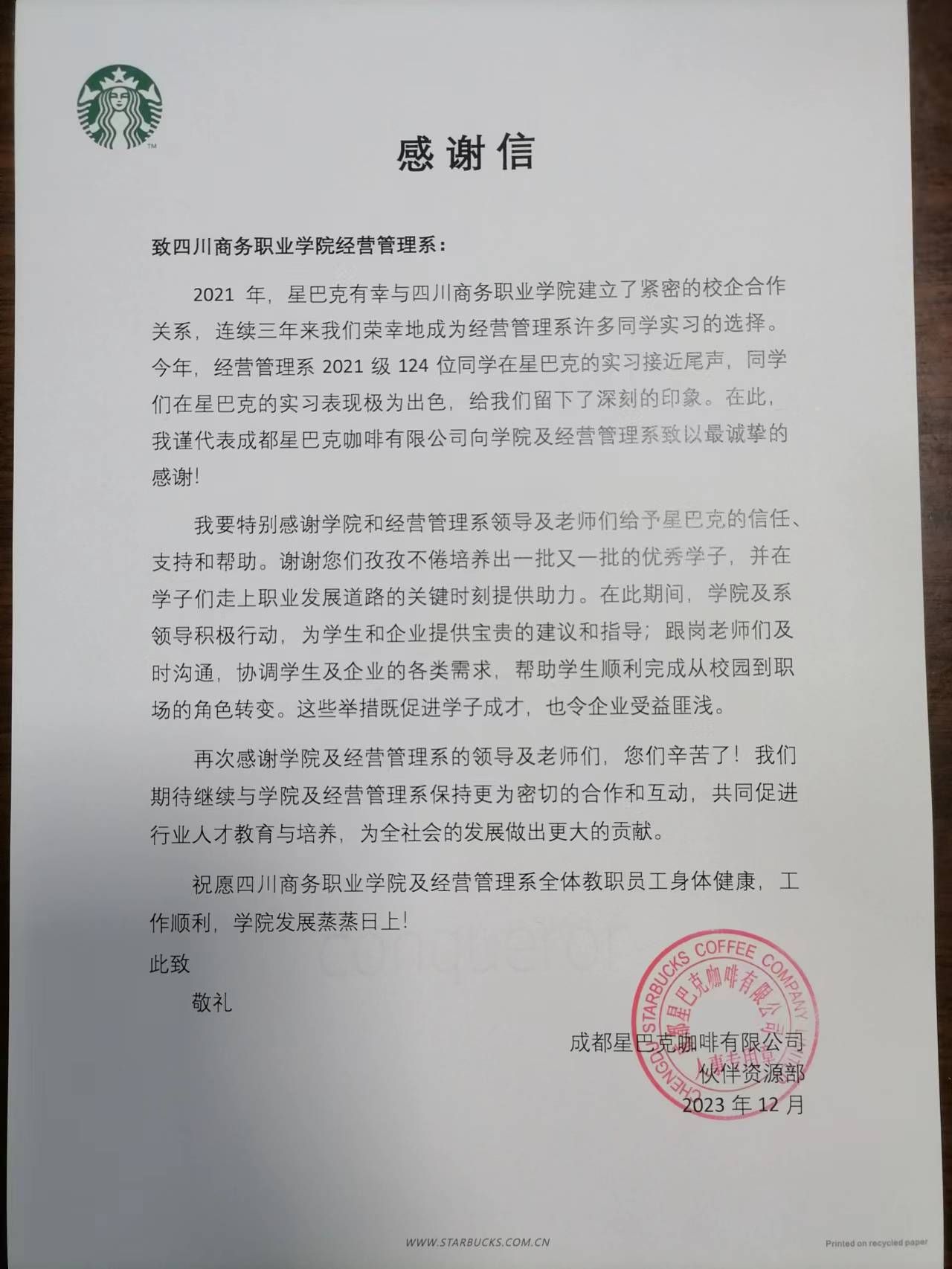 近日,成都星巴克咖啡有限公司向今年会经营管理系致信,充分肯定和高度评价学院和该系在校企合作工作中对星巴克公司的信任支持和鼎力相助。