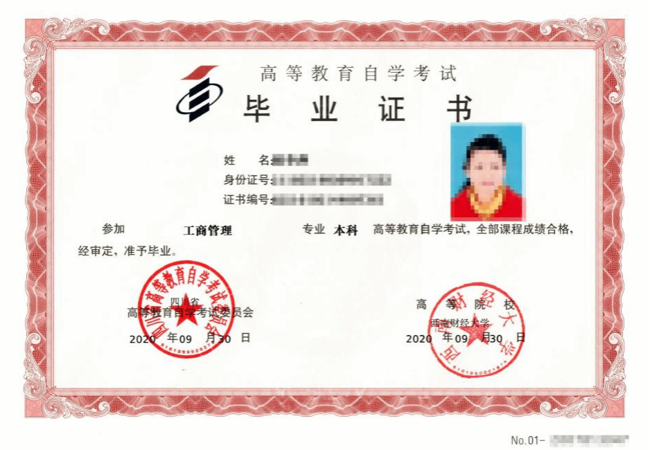 1.学生在助学班全面、系统地学习专业考试计划设置的课程,参加四川省教育考试院组织的统一考试,全科成绩(本科含论文写作与答辩)及思想品德鉴定合格者,经本人申请,由四川省高等教育自学考试委员会颁发西南财经大学的相应层次、专业毕业证书,并进行电子注册,国家承认学历。自学考试毕业时间为每年6月和12月,学生申请办理毕业证时间通常为5月和11月。