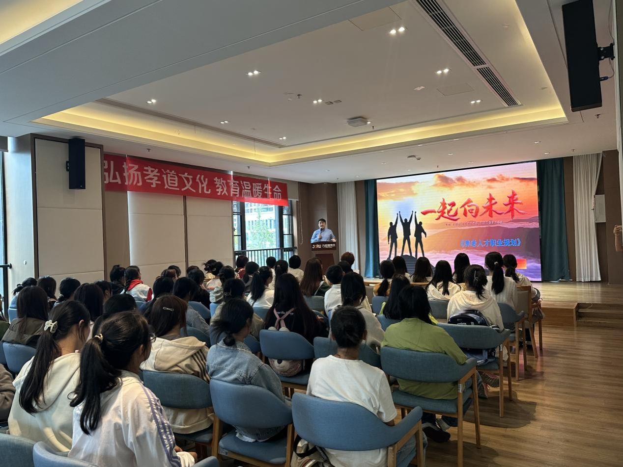 九如城西南中心总经理刘程致欢迎辞,为全体师生进行《养老新青年职业规划》主题分享,他介绍了公司的发展历程以及企业文化,并从企业案例中出发,深入浅出地为同学们讲解行业发展趋势;李佳幸为学员们进行《青春无畏 热爱有光》主题分享,她谈及自身进入行业以来走过的心路历程,以过来人的经验叮嘱新生们努力学习打好基础,珍惜在校时光。4名零零后养老新青年向大家讲述了自己在养老一线工作中经历的许多感人故事。