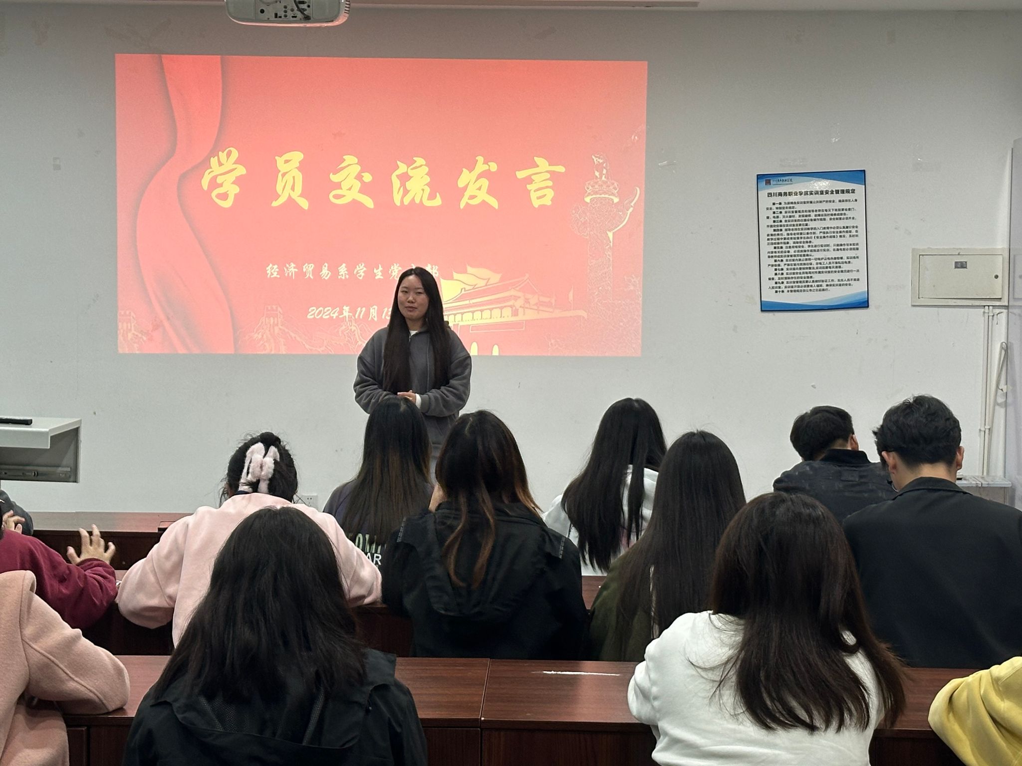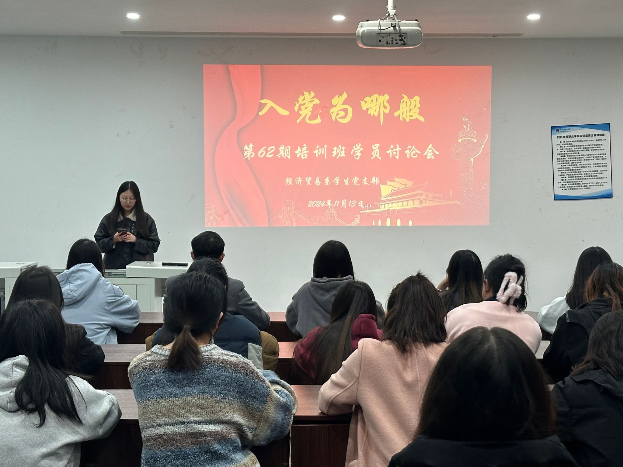 11月13日晚,经济贸易系学生党支部在5104教室召开2024年下半年党培对象“入党为哪般”专题讨论会。学生支部书记马如龙,第62期入党积极分子、发展对象和预备党员培训班全体学员参加讨论活动。