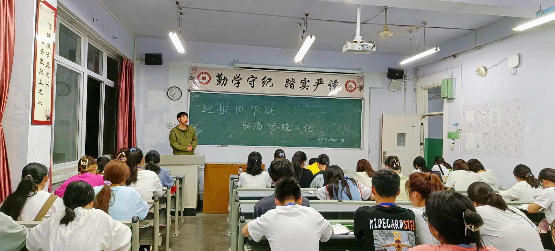 此次活动由各班班委进行组织,以蓬勃大气,鲜艳热情的国旗为背景,以“迎祖国华诞,弘扬传统文化”为主题,在班会活动中宣传武术,戏剧,糖画等传统文化。