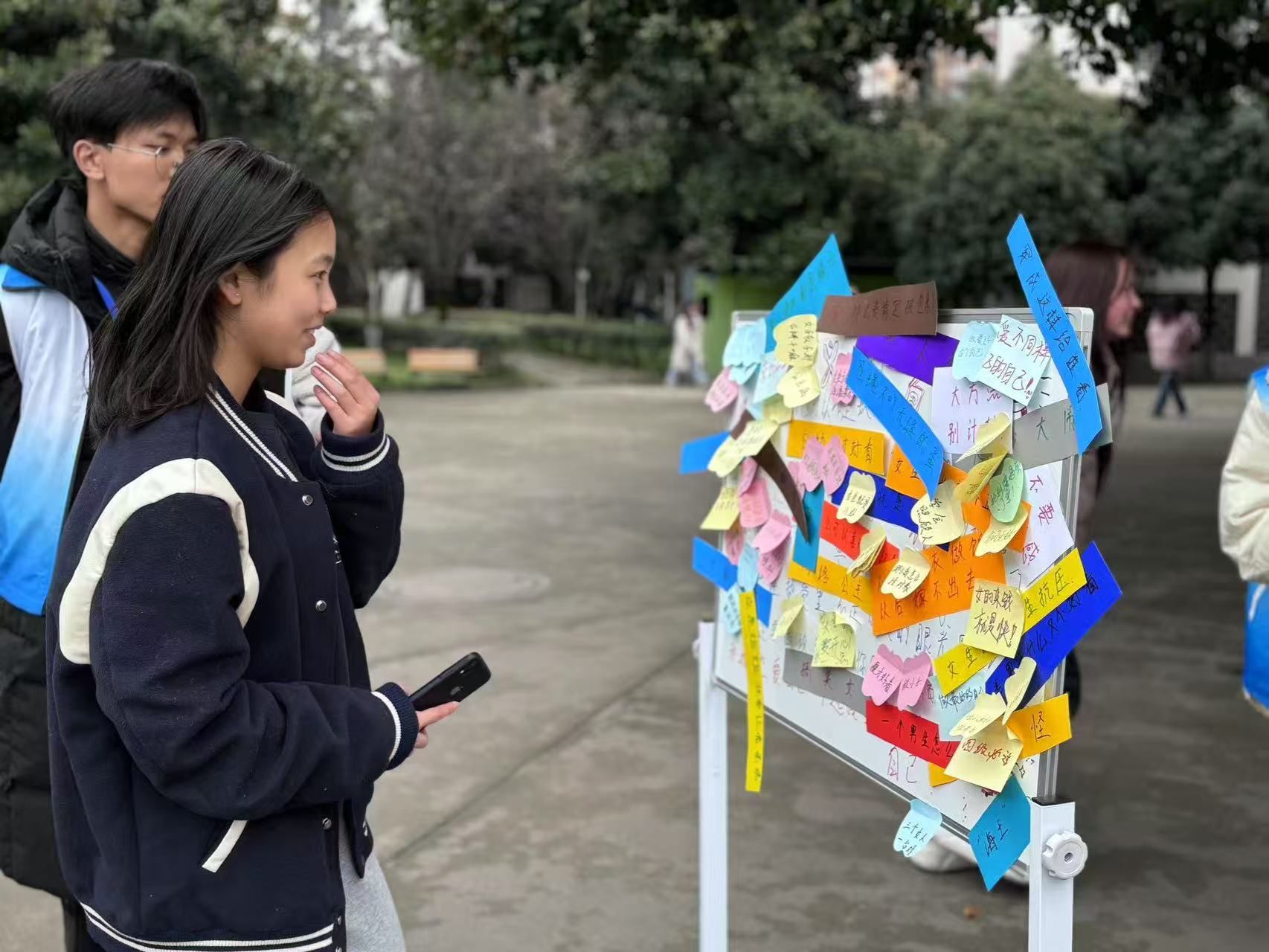 随着最后一个标签被撕下,活动也接近尾声。志愿者们与寄语展示板合影留念,为这次活动画上了完美的句号。活动结束后,志愿者们认真打扫场地,确保校园环境整洁,展现了高度的责任感和团队精神。