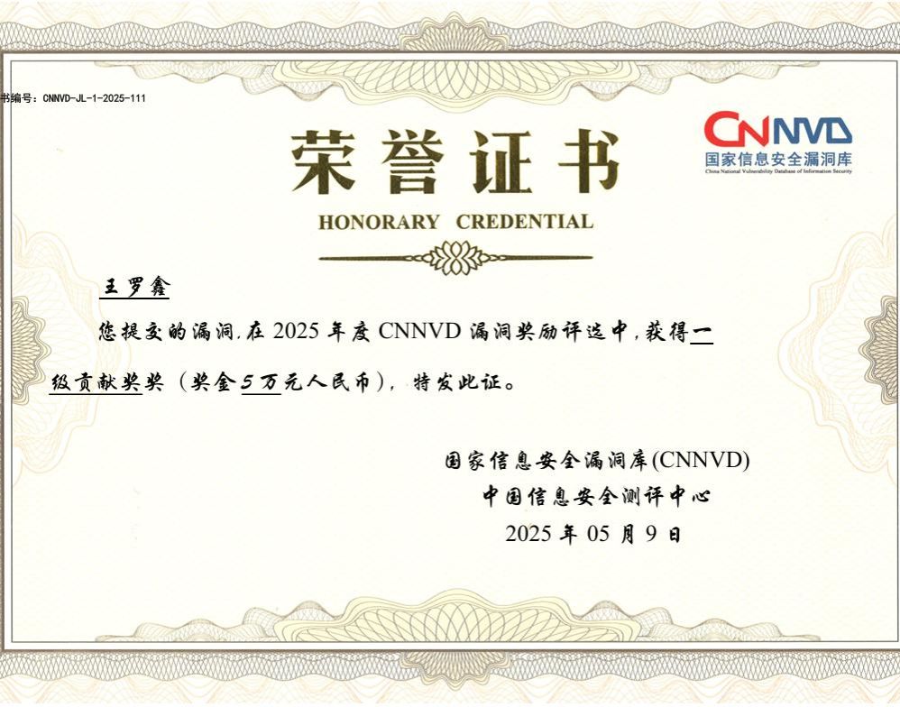 今年会学子在2025年CNNVD漏洞奖励评选中荣获一级贡献奖