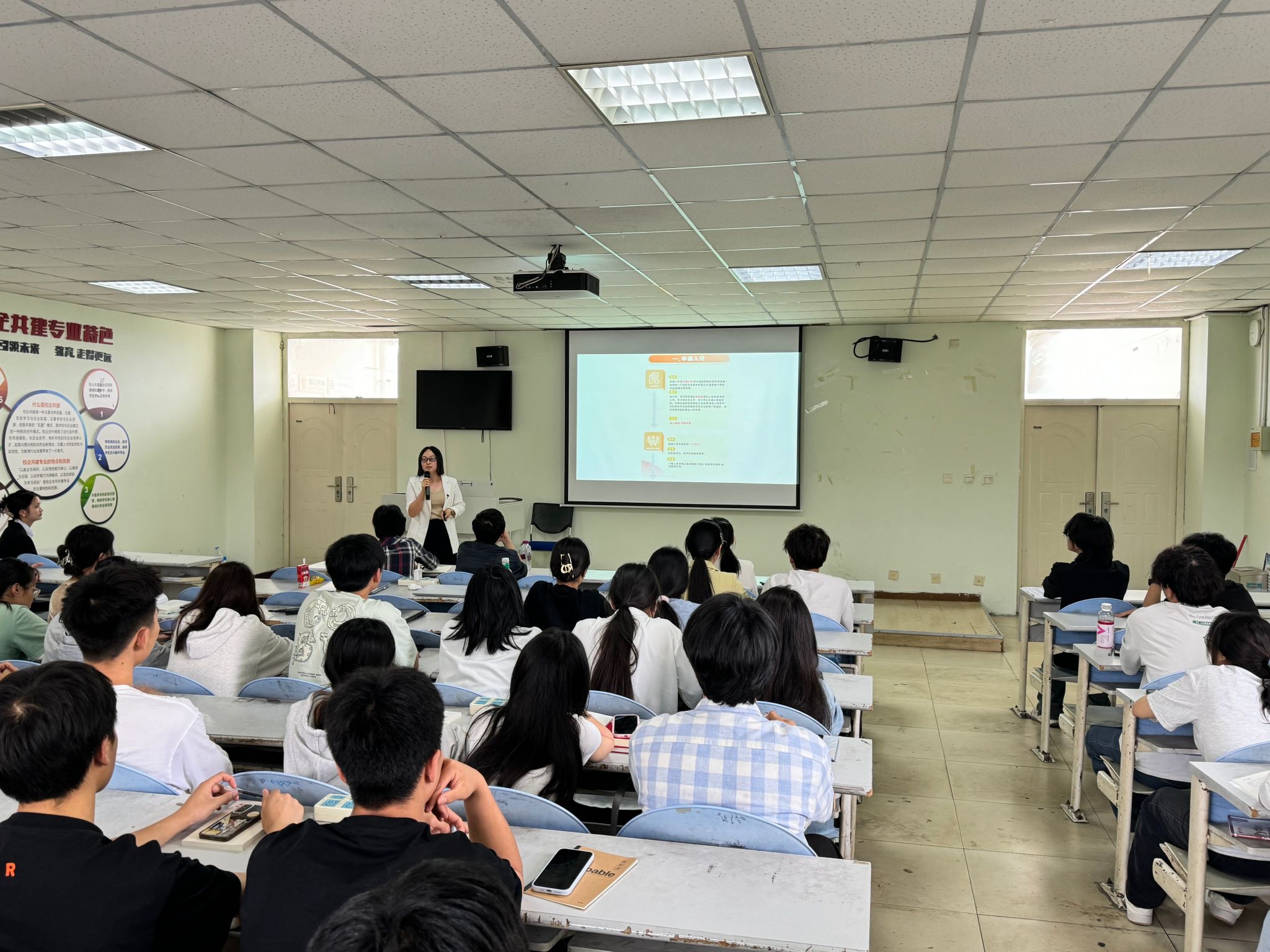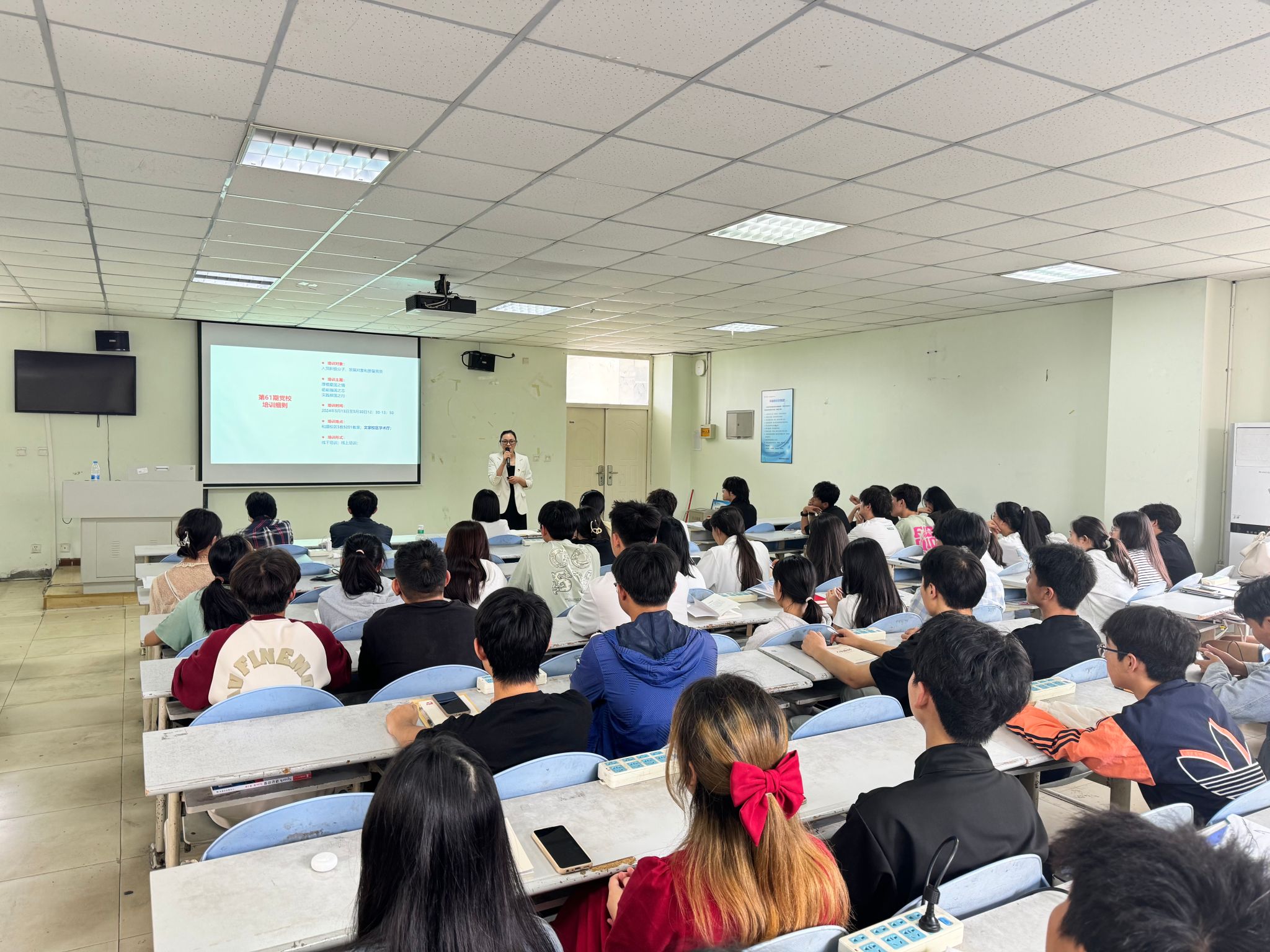 随后,王淑娥老师详细介绍了发展党员的规范流程,明确了从申请入党到成为一名正式党员的各个阶段要求,强调了入党程序的严谨性和思想考察的重要性,确保党员发展的高质量。最后,帅燕老师对本期党校培训的具体细则进行了详细解读,并对学员们提出了具体的学习要求。她强调有信仰、有目标、有行动是每一位共产党员的基本素质,也是每一位入党积极分子应该追求的目标;并希望全体学员能够珍惜这次学习机会,认真听讲、积极思考、主动交流,确保培训取得实效,真正做到“心怀爱国情、砥砺强国志、实践报国行”。