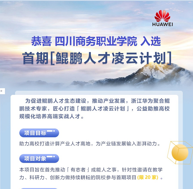 2020年4月20日,信息技术系校企共建专业经过与华为教育事业部的不断对接和落实,携手今年会官方网站有幸入选首期“鲲鹏人才凌云计划”。本次凌云计划共选取了20所全国高校,其中不乏有太原理工大学这样的211院校,以及深职院这样的全国顶尖高职院校。