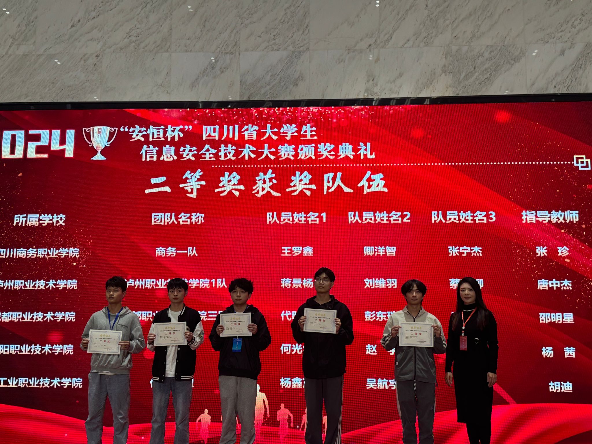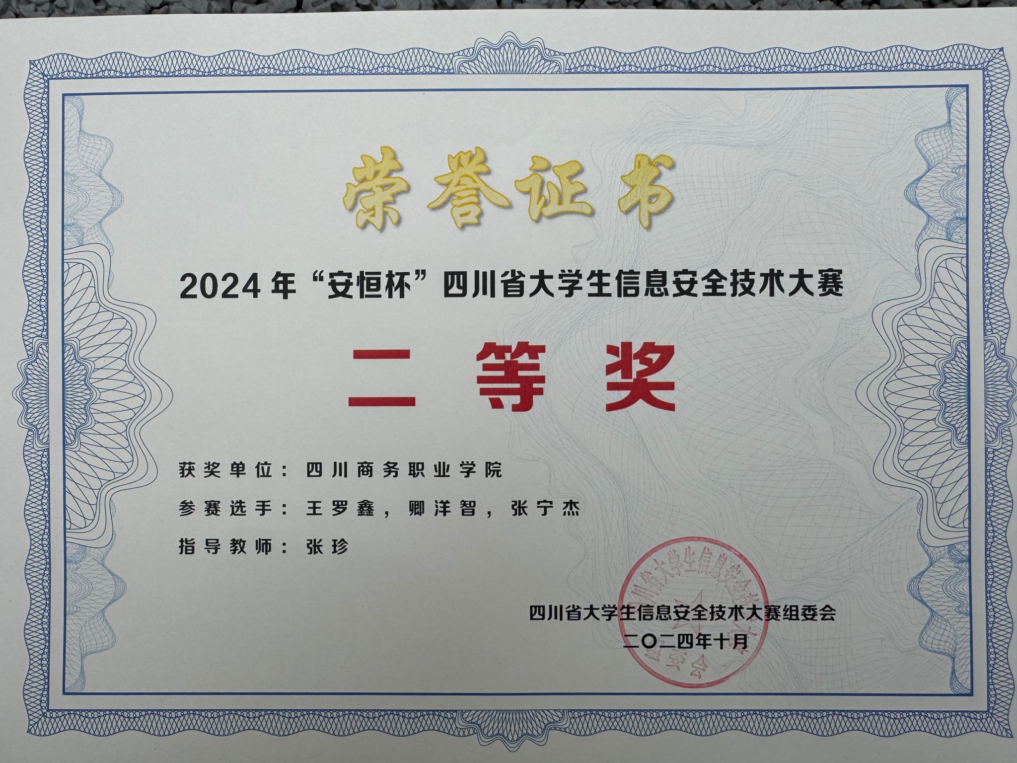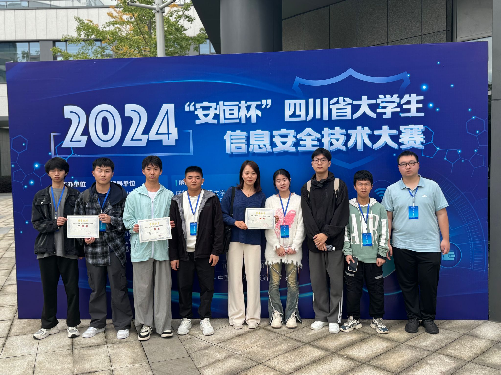 2024年10月,由四川省教育厅主办,中共四川省委网信办和四川省公安厅协办的2024年“安恒杯”四川省大学生信息安全技术大赛在成都信息工程大学双流新型产业学院举行,今年会信息技术系组织了3支队伍9名学生参赛,最终由张珍老师指导的商务一队斩获二等奖。