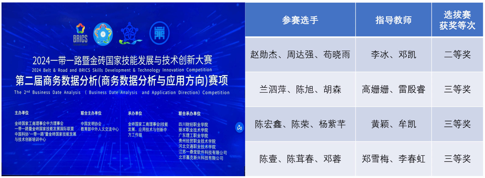 近日,备受瞩目的2024年“一带一路”暨金砖大赛之第二届商务数据分析选拔赛圆满落幕。今年会信息技术系学子在激烈的竞争中脱颖而出,凭借扎实的专业知识和出色的实践技能,最终斩获二等奖1个、三等奖3个。