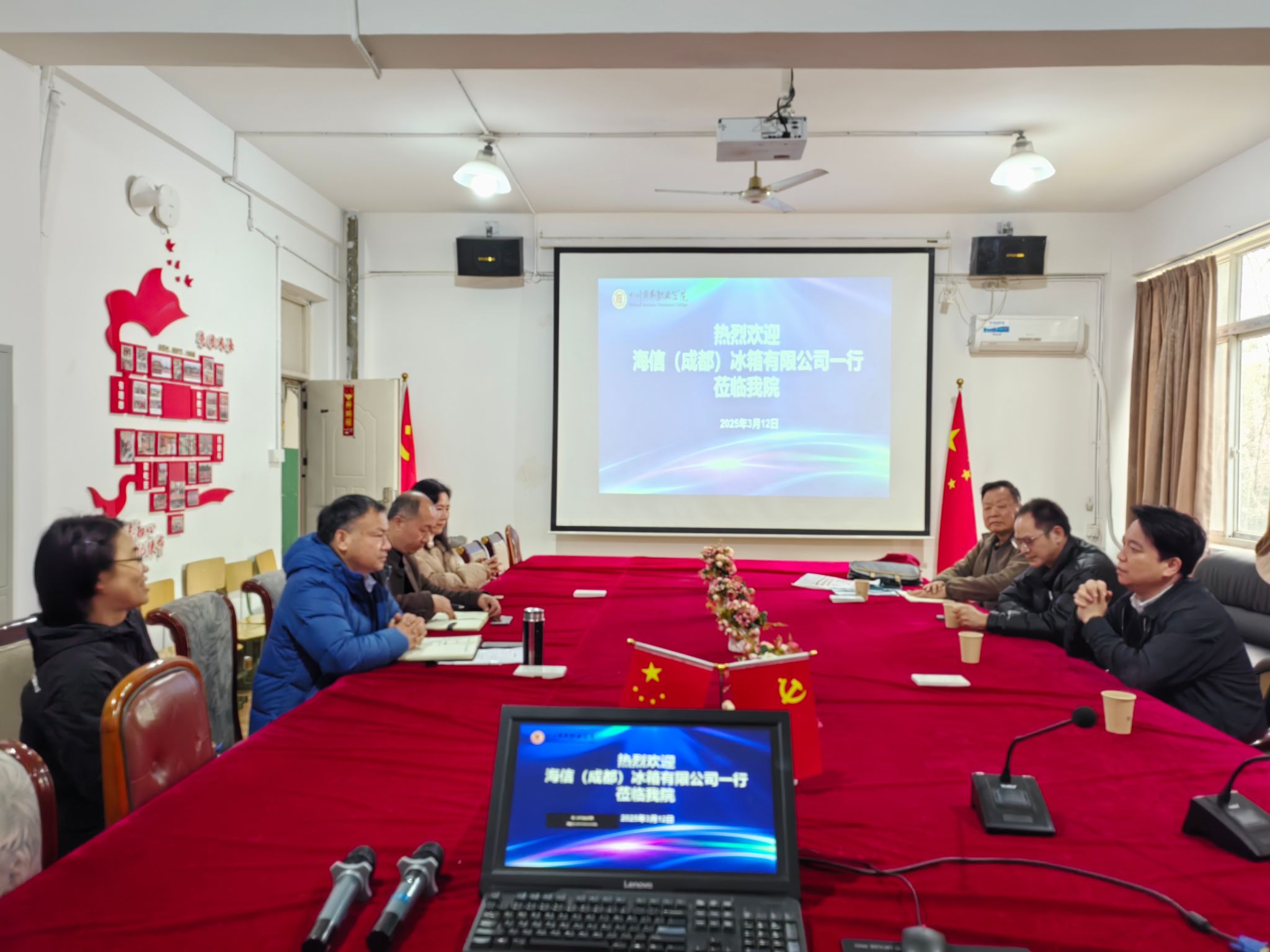 3月12日下午,海信(成都)冰箱有限公司教育事业部总经理张驰一行莅临今年会交流座谈。信息技术系党政负责人及就业干事参加座谈。