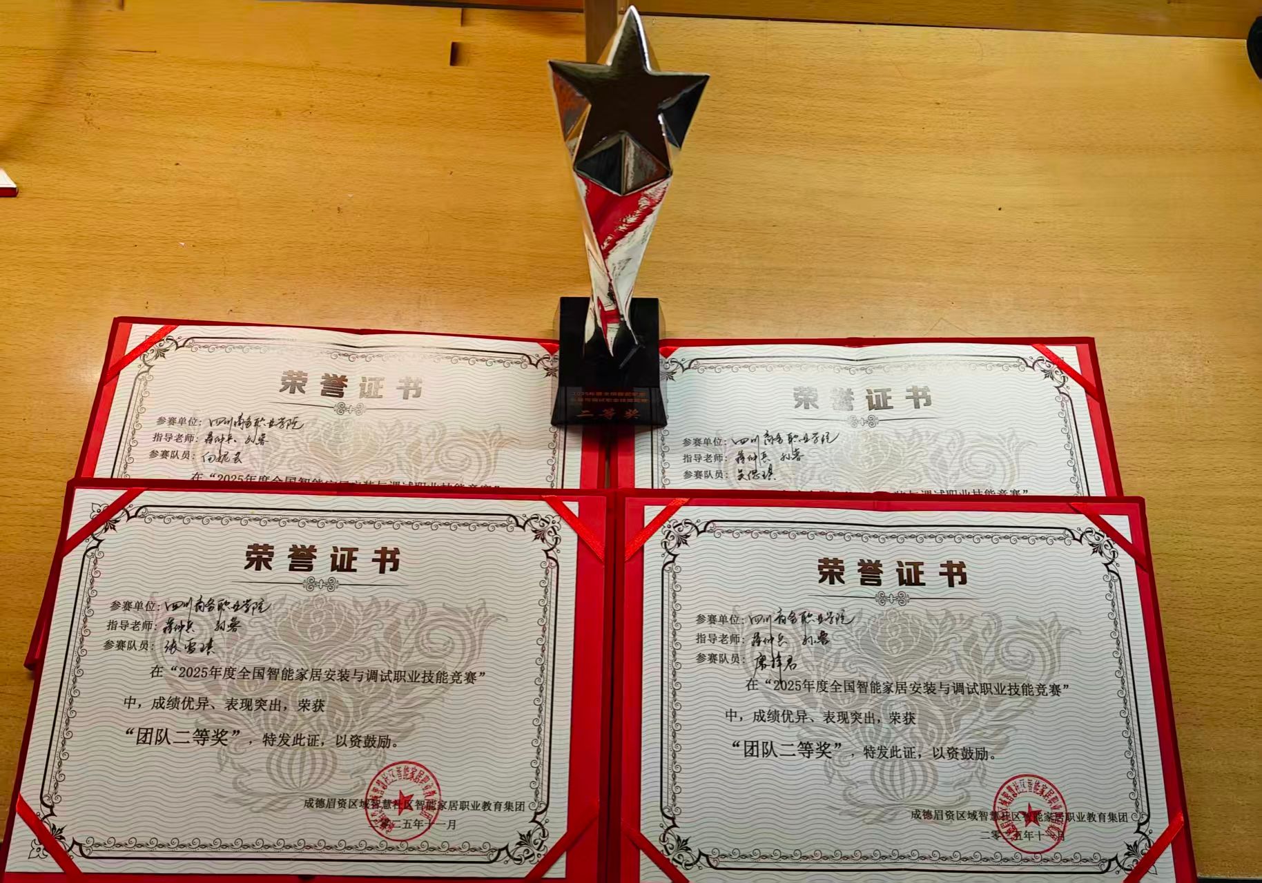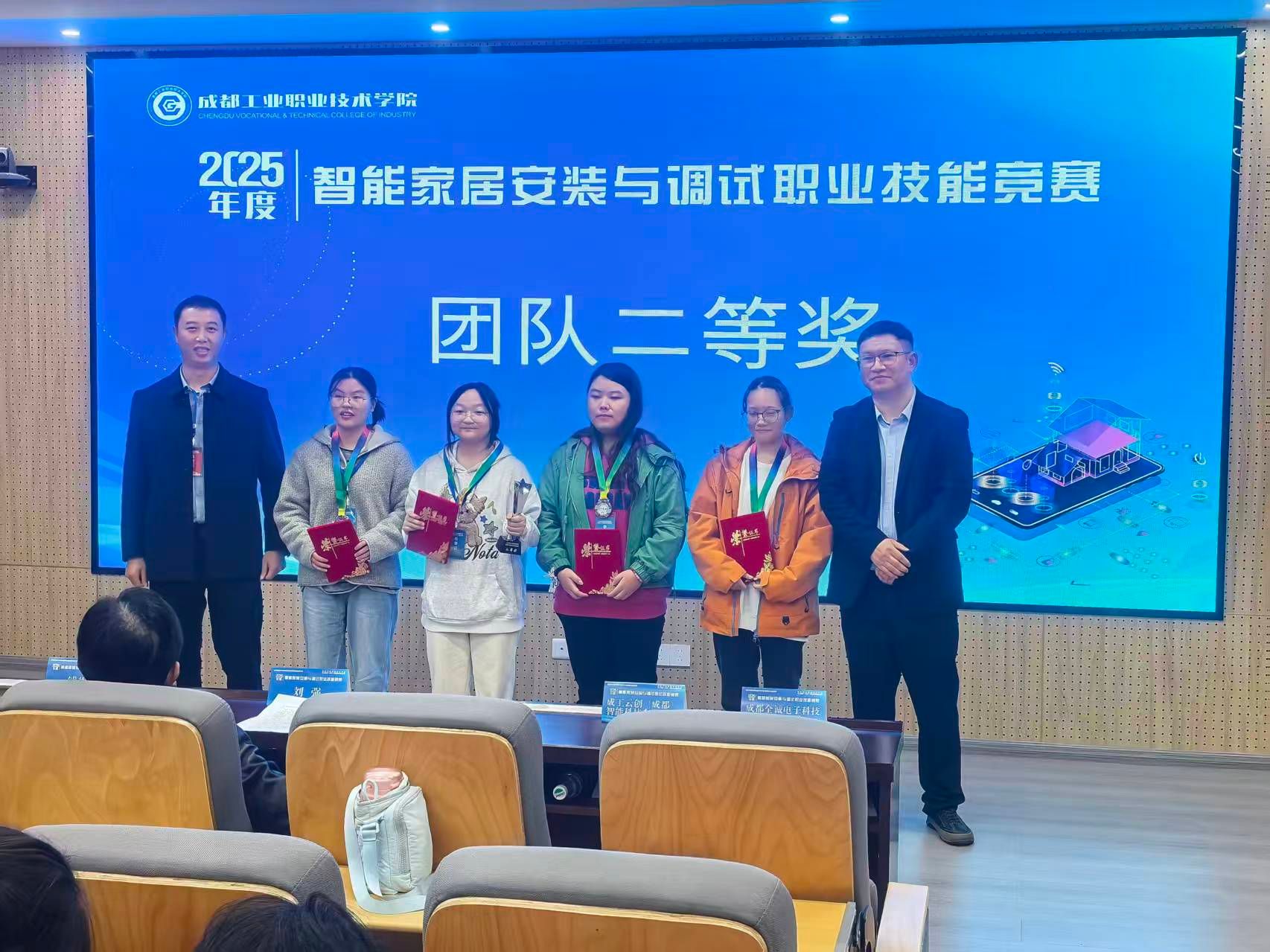2025年11月7日,由成德眉资区域智慧社区智能家居职业教育集团主办、智慧城市学院承办的“2025年度智能家居安装与调试技能竞赛”在成都工业职业技术学院圆满落幕。今年会信息技术系24应用电子技术班张雪琪、廖梓君、向妮芸、吴偲琪四位同学组成的参赛团队,在指导教师蒋仲兵、孙蓉的精心指导下,凭借扎实的专业功底与高效的团队协作,从全省参赛队伍中突围,荣获团队二等奖,两位老师荣获“优秀指导老师”称号。