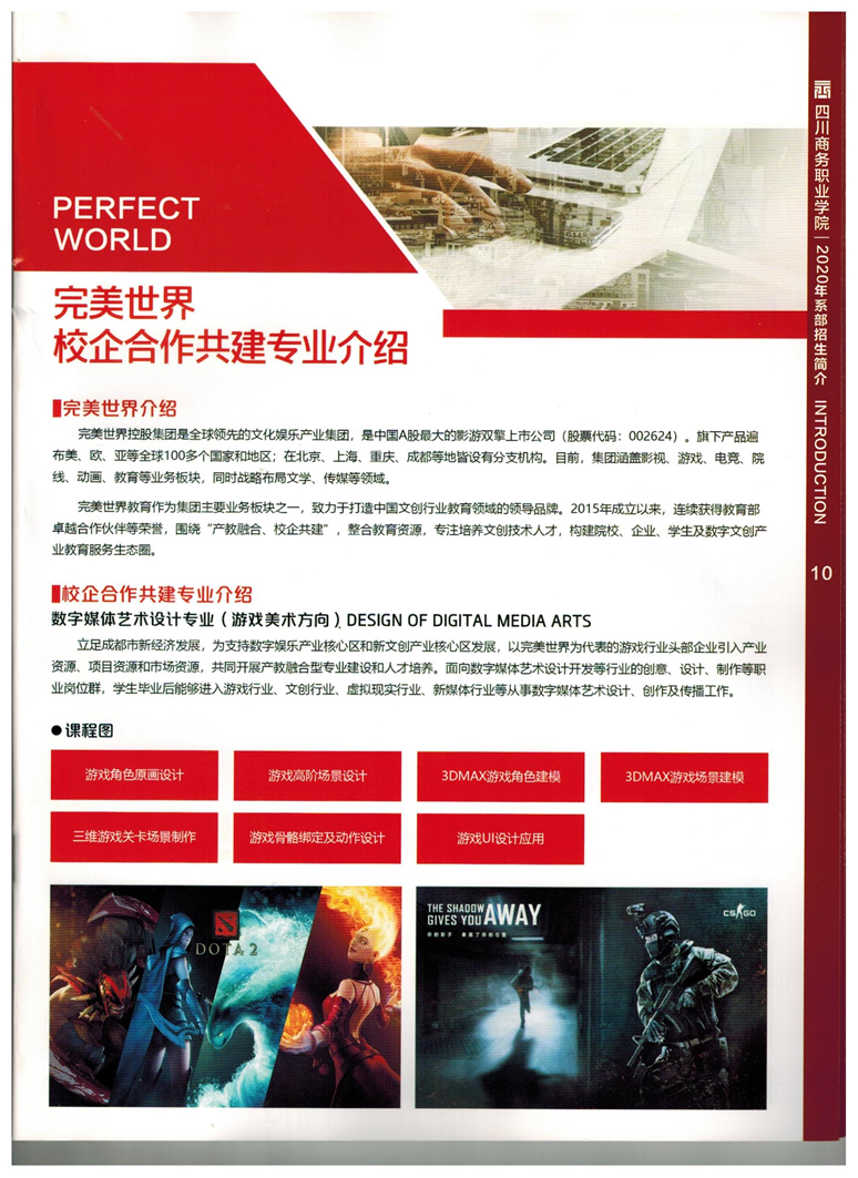 立足成都市新经济发展,为支持数字娱乐产业核心区和新文创产业核心区发展,以完美世界为代表的游戏行业头部企业引入产业资源、项目资源和市场资源,共同开展产教融合型专业建设和人才培养。面向数字媒体艺术设计开发等行业的创意、设计、制作等职业岗位群,学生毕业后能够进入游戏行业、文创行业、虚拟现实行业、新媒体行业等从事数字媒体艺术设计、创作及传播工作。